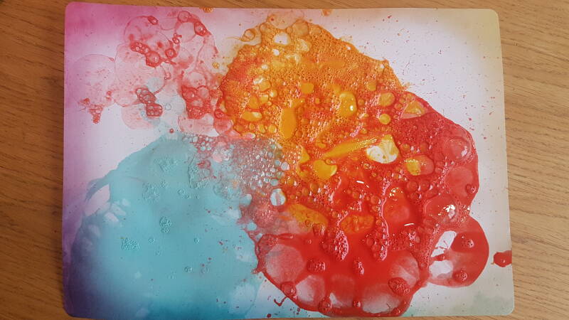 Je kan nog meer kliederen. Dan zet je het glas/bakje met de verf op een blad en blaast dan bellen. Je laat ze over de rand stromen en op je blad neerkomen.