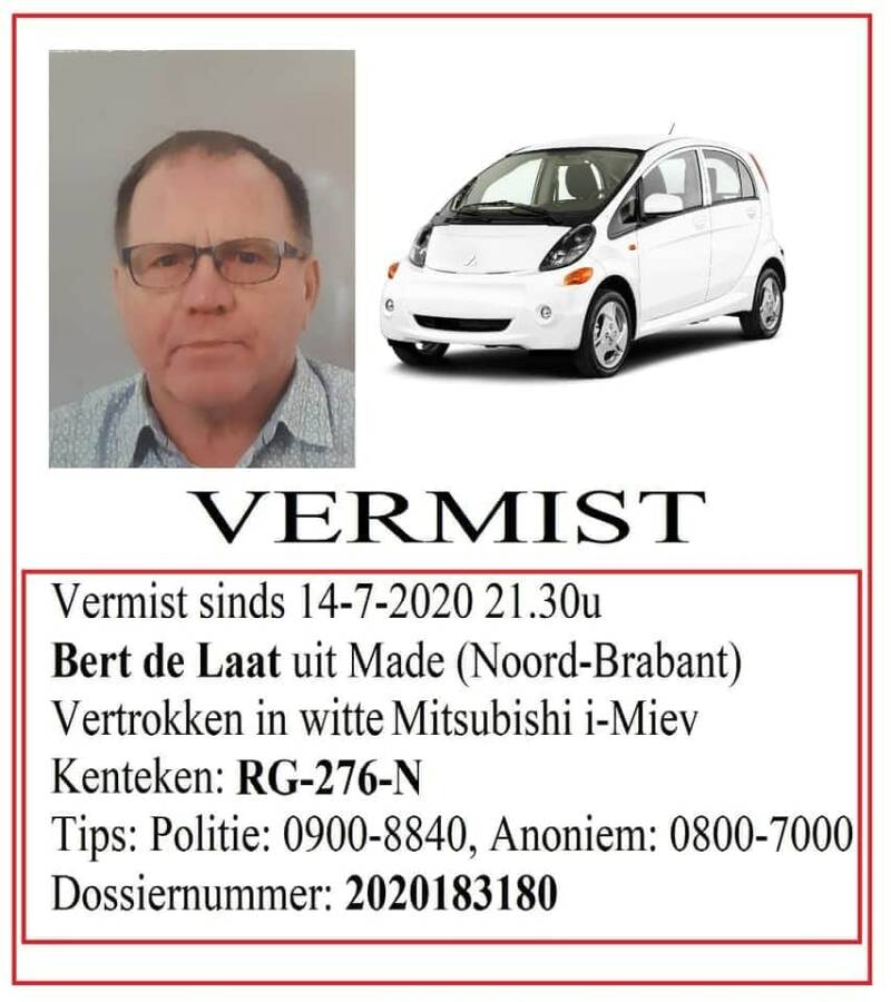 Bert de Laat is sinds dinsdagavond 14-07-2020 vermist, hij is het laatst gezien in Made. Hij rijdt in een witte Mitsubishi i-MiEV voorzien van het kenteken RG-276-N.